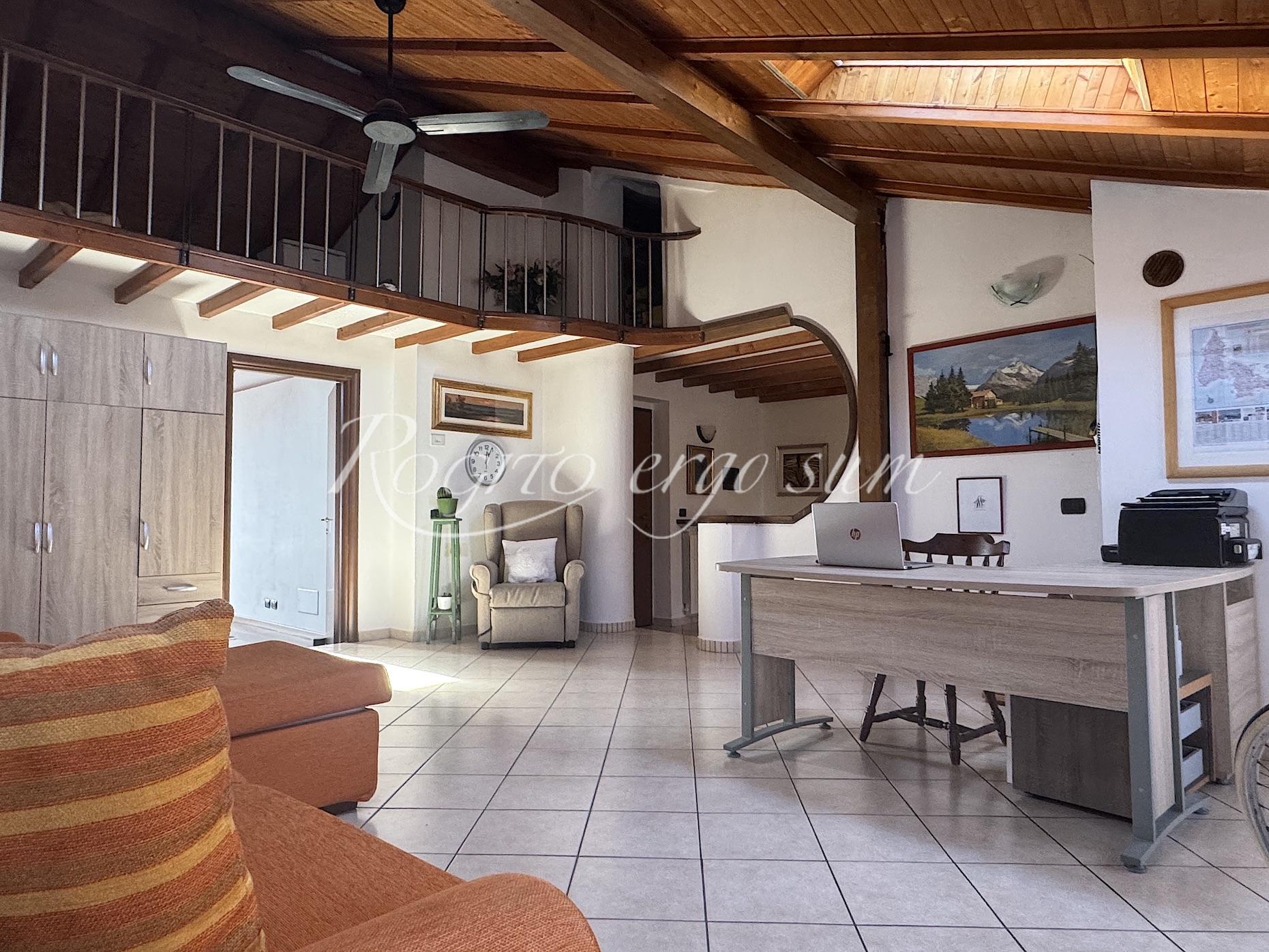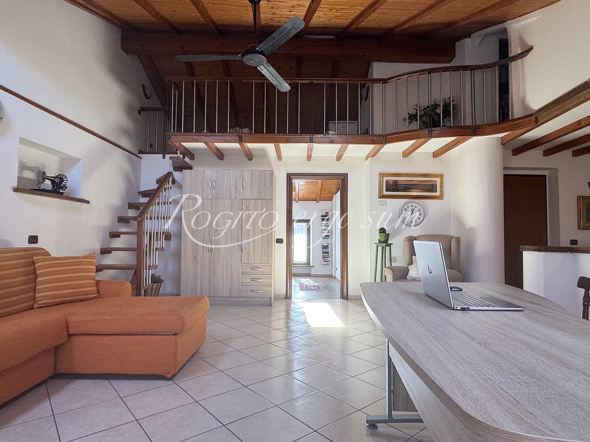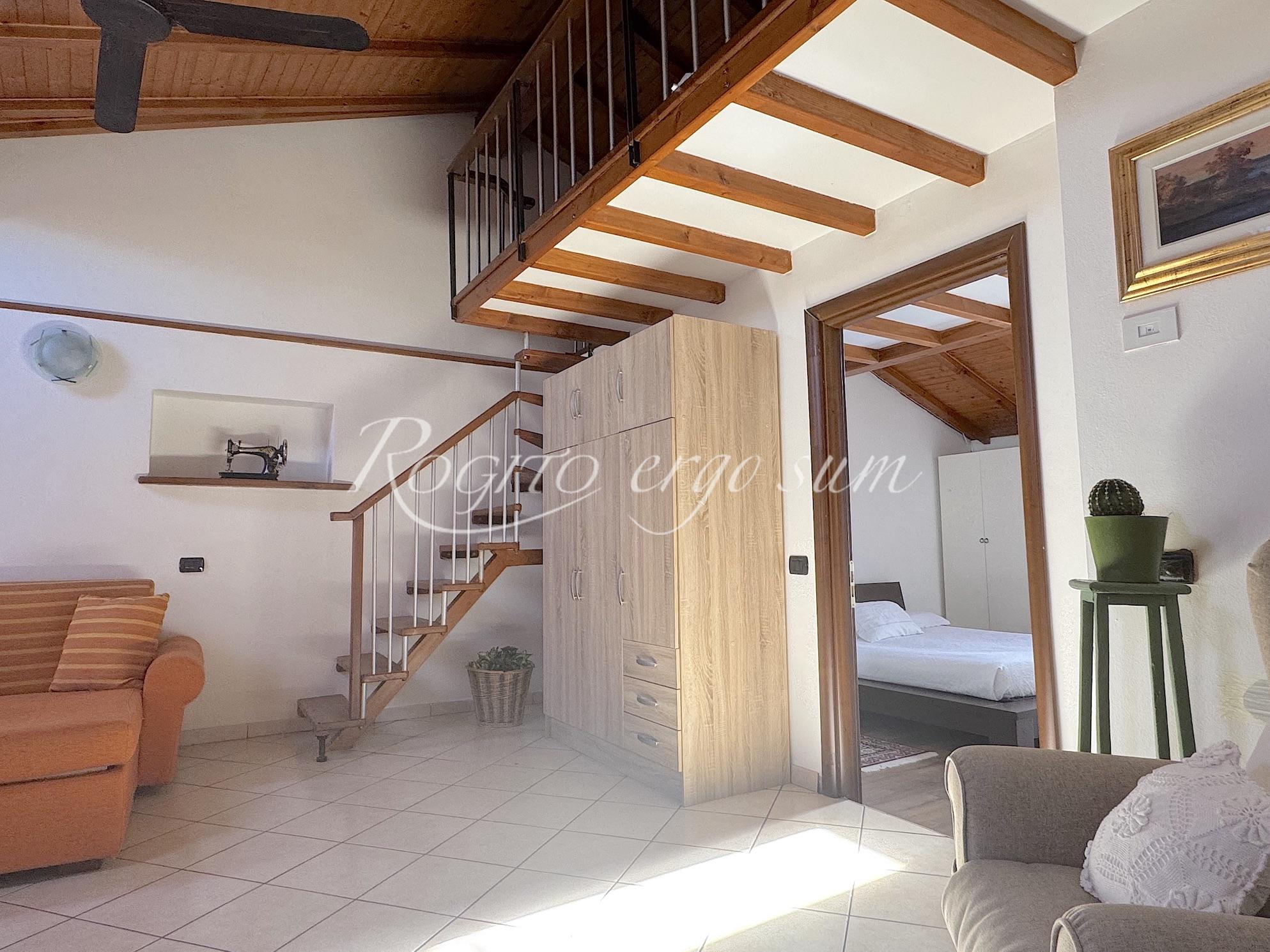 Un’elegante scala in legno, conduce al piano superiore che si sviluppa con disimpegno, ampio soggiorno/studio con soppalco e ripostiglio, camera da letto matrimoniale e bagno. Il tutto si affaccia su loggiato coperto. Nella proprietà è compreso giardino di pertinenza, a corpo staccato, con possibilità di parcheggio per due auto, chiuso da cancello. Non ci sono spese condominiali.